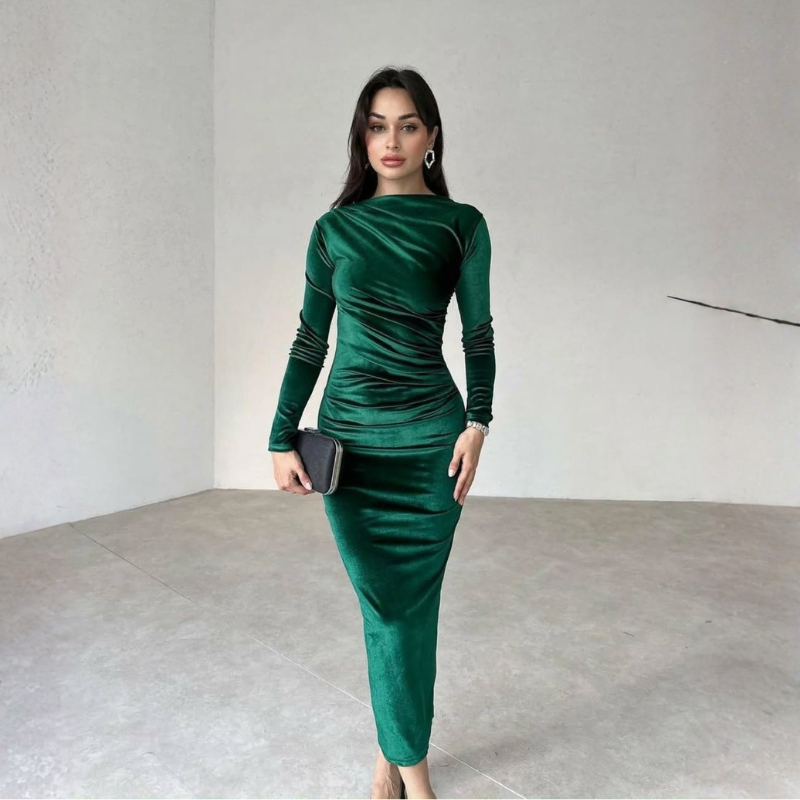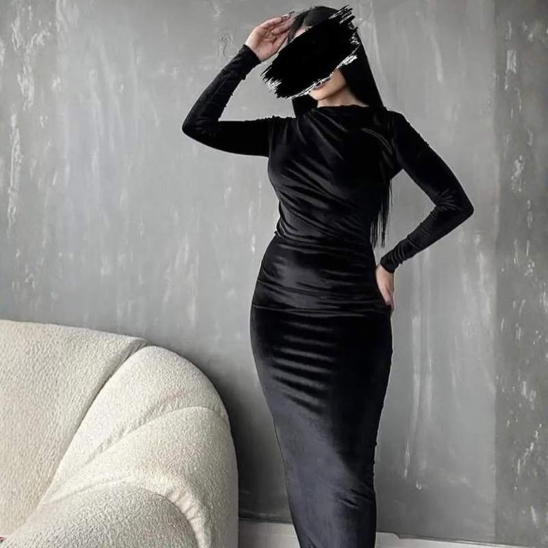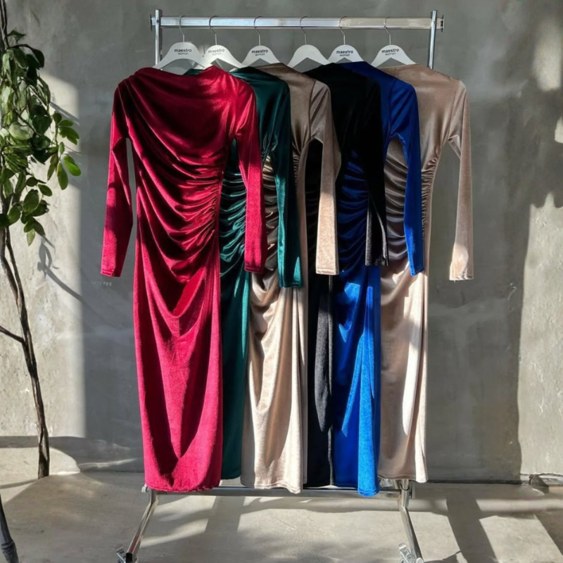 فستان مخمل شتوي عملي بتصميم واسع وأنيق، يجمع بين الراحة والشكل المرتب في قطعة واحدة.
