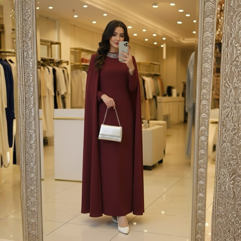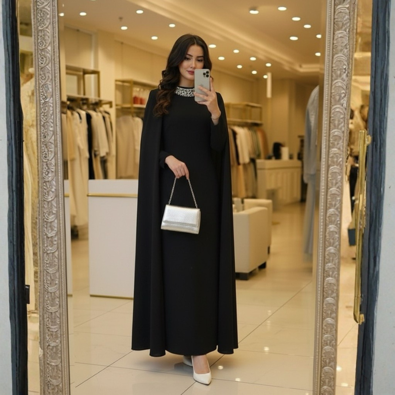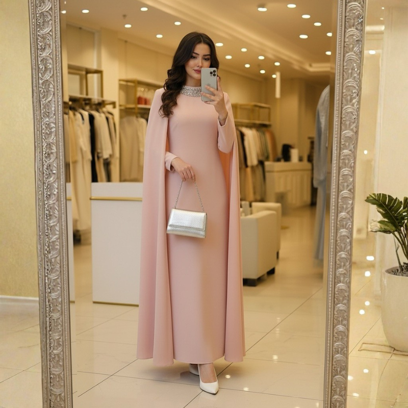 يمكن تنسيقه مع كعب عالي وشنطة كلاتش وإكسسوارات ذهبية أو فضية حسب اللون المختار، ليكون جاهزًا لحفلات الخطوبة، السهرات العائلية، حفلات الزفاف كضيفة، والمناسبات الرسمية.