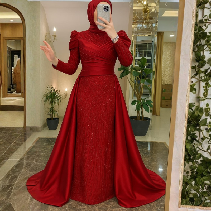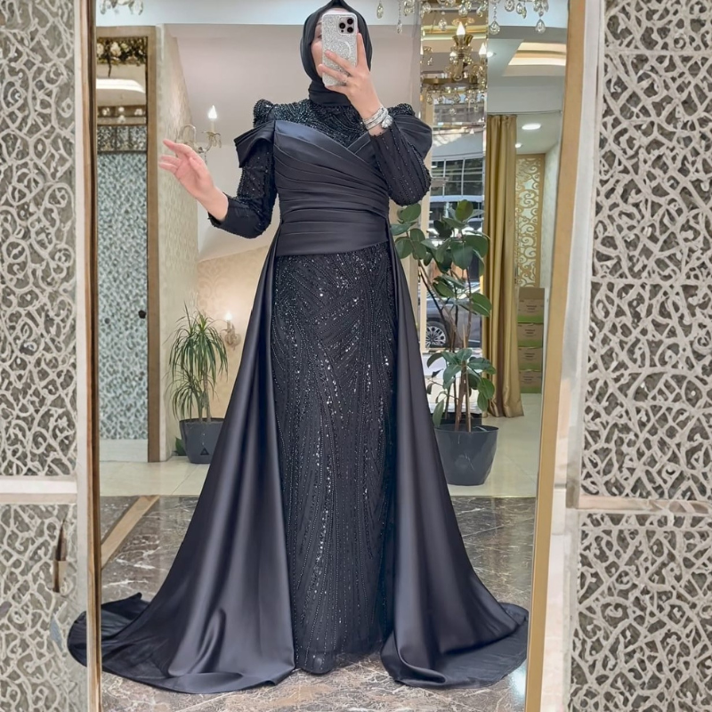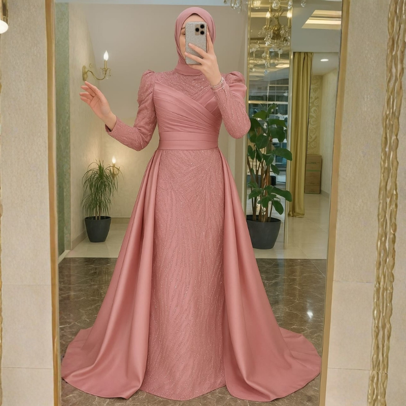 الطبقة الأساسية من ساتان ناعم بلمعة راقية تعكس الإضاءة بنعومة، مع تطريز كفيار يضيف بعدًا غنيًا للتصميم ويبرز تفاصيل الفستان بشكل أنثوي أنيق.