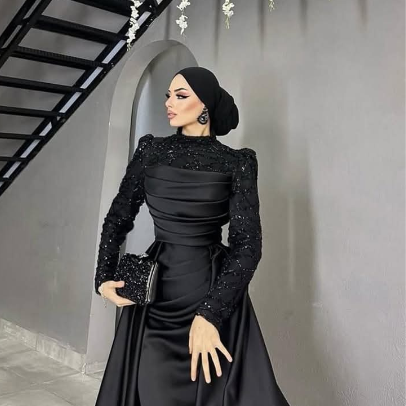 الطبقة الأساسية من ساتان ناعم بلمعة راقية تعكس الإضاءة بنعومة، مع تطريز كفيار يعطي تفاصيل غنية وفخمة على الصدر أو الجسم حسب التصميم، ليبرز أنوثة القوام بأسلوب راقٍ بدون مبالغة.