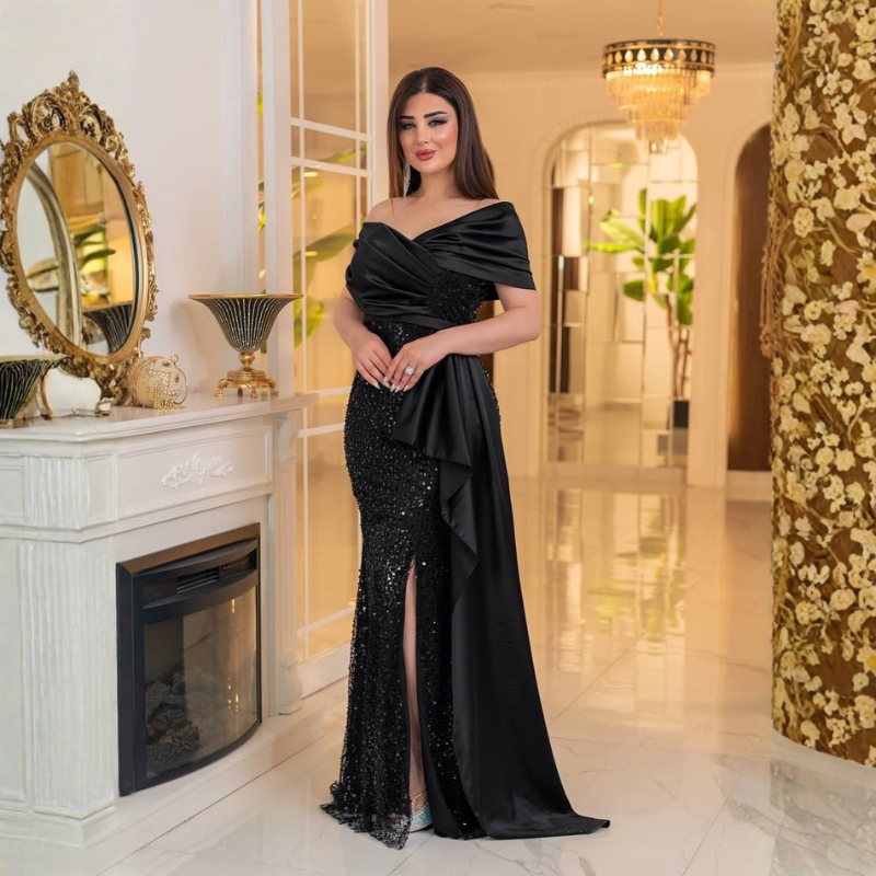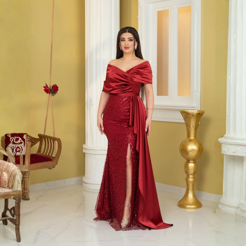 فستان سهرة ترتر مع ساتان بتصميم أنثوي واضح يمنحك حضورًا قويًا في أي مناسبة.