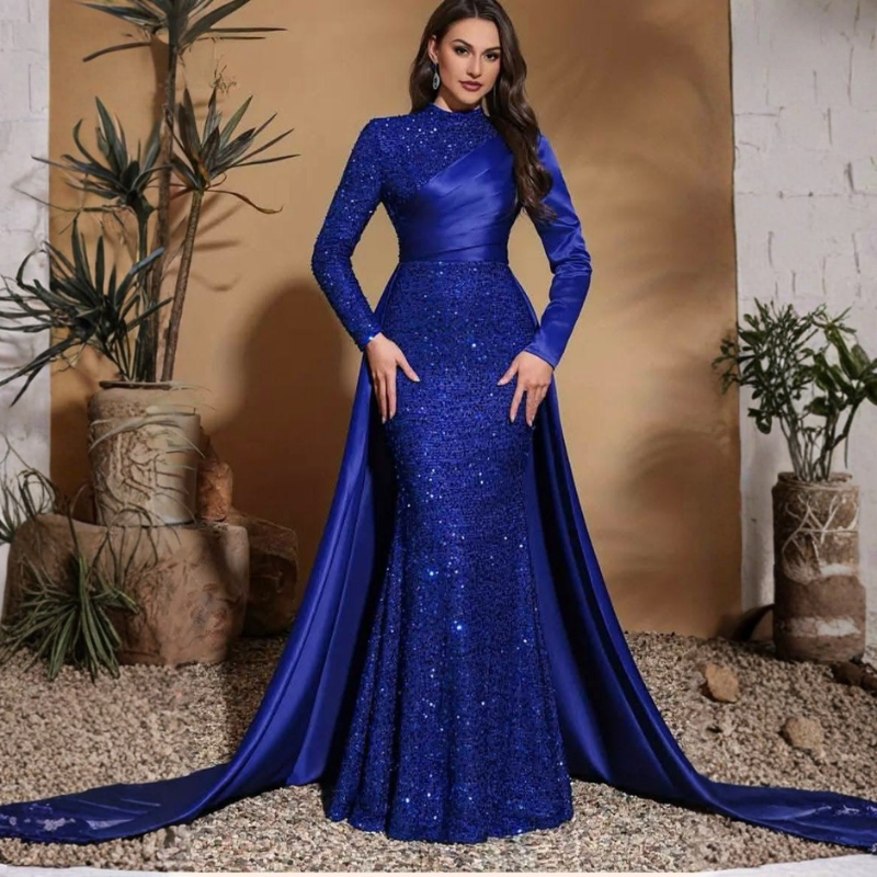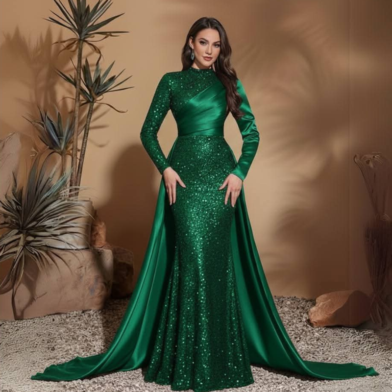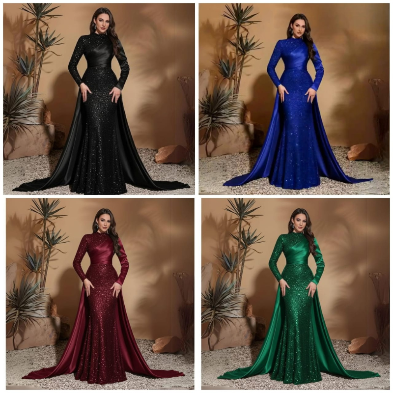 فستان سهرة ترتر مع ساتان فاخر بتصميم لامع وواضح يناسب السهرات الكبيرة والمناسبات الخاصة.