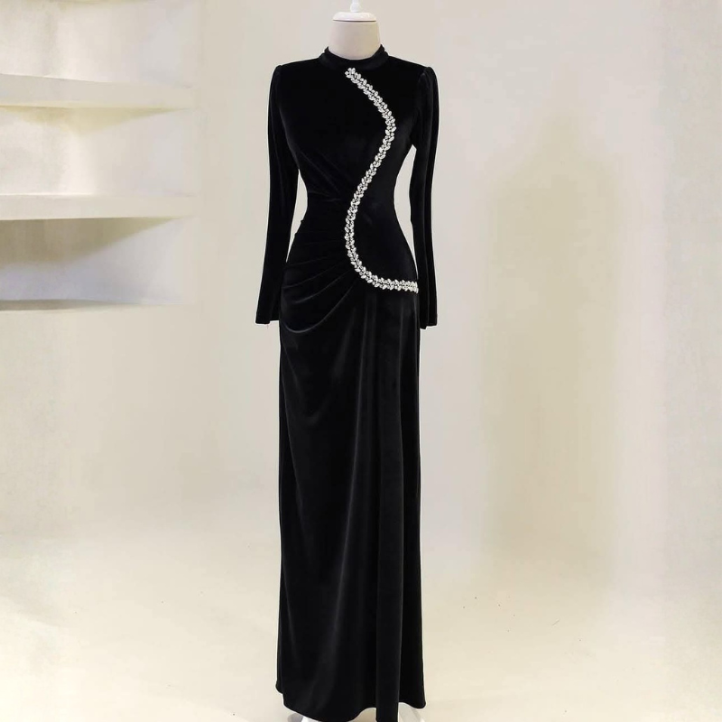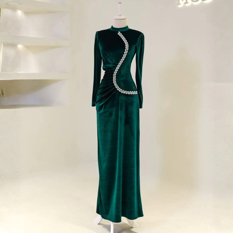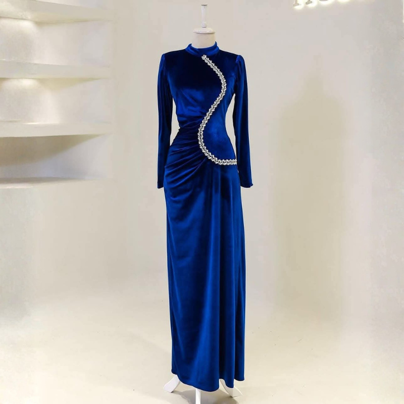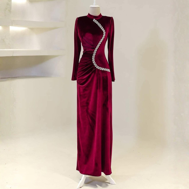 فستان سهرة مخمل واسع بتصميم أنيق يناسب الإطلالات المسائية والمناسبات الخاصة مع لمسة فخامة واضحة في القماش والألوان.