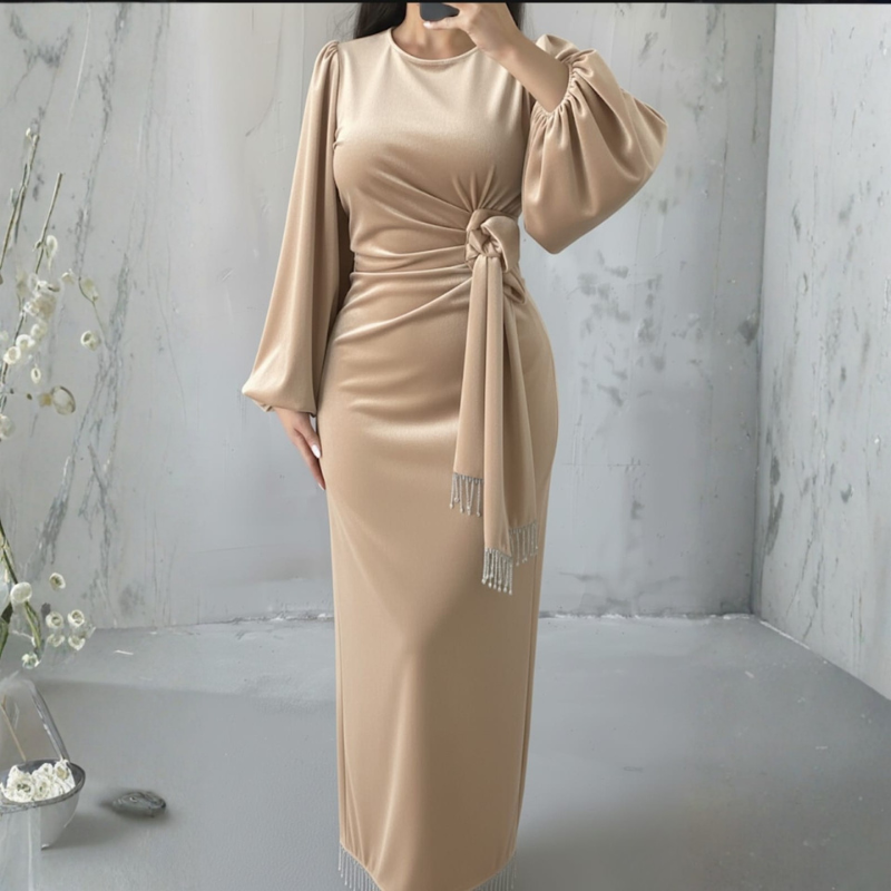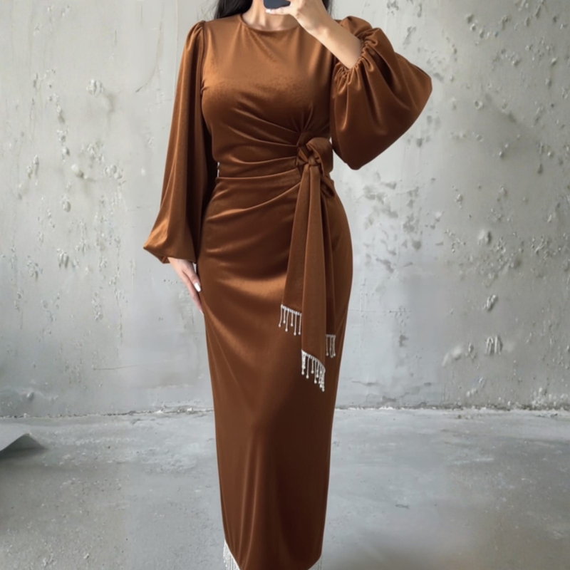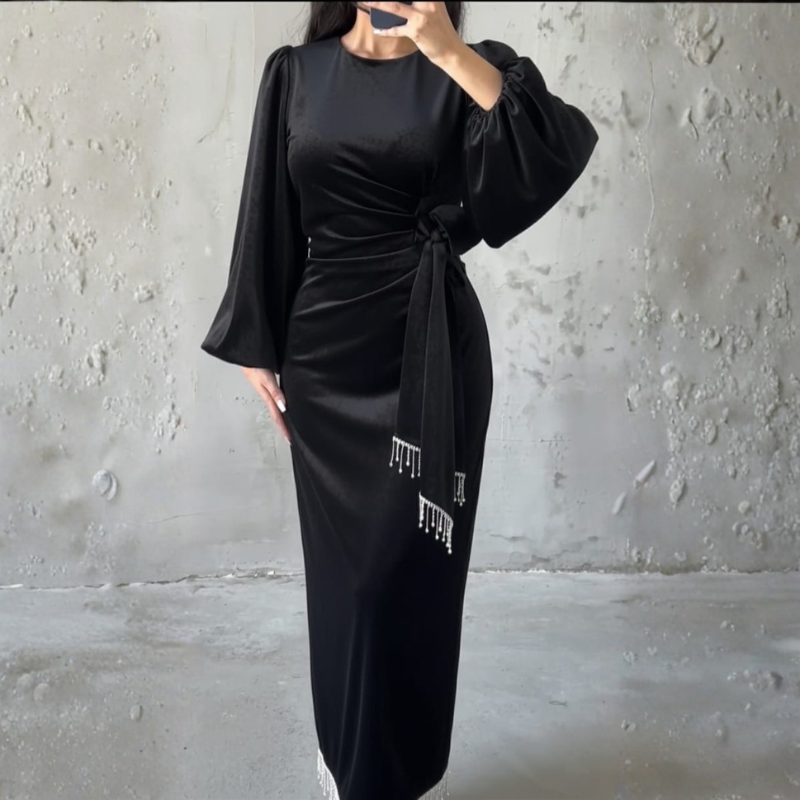 فستان سهرة مخمل شتوي بتصميم عملي وأنيق، من القطع الأكثر طلباً في تشكيلة #شتاء25_26.