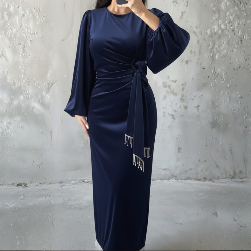 يمكن تنسيقه بسهولة مع بوت أو كعب عالي ومعطف أو جاكيت طويل لإطلالة شتوية متكاملة، سواء للمناسبات المسائية العائلية أو الطلعات الخاصة.